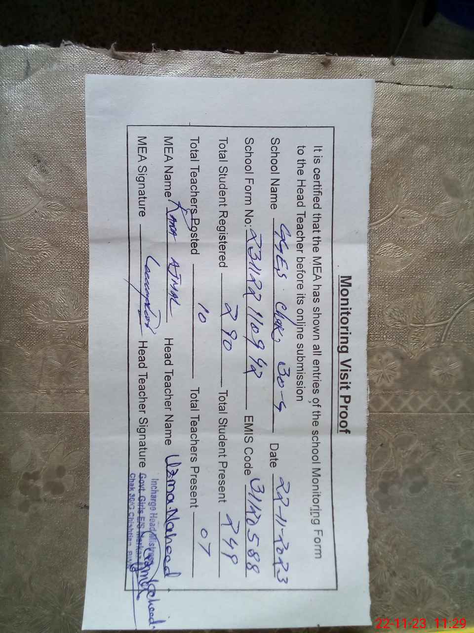 | Name: Ar**** Iq**** Designation: (School Headmaster's/Headmistress's) S.S.T Phone/Cell Number: 03**** |