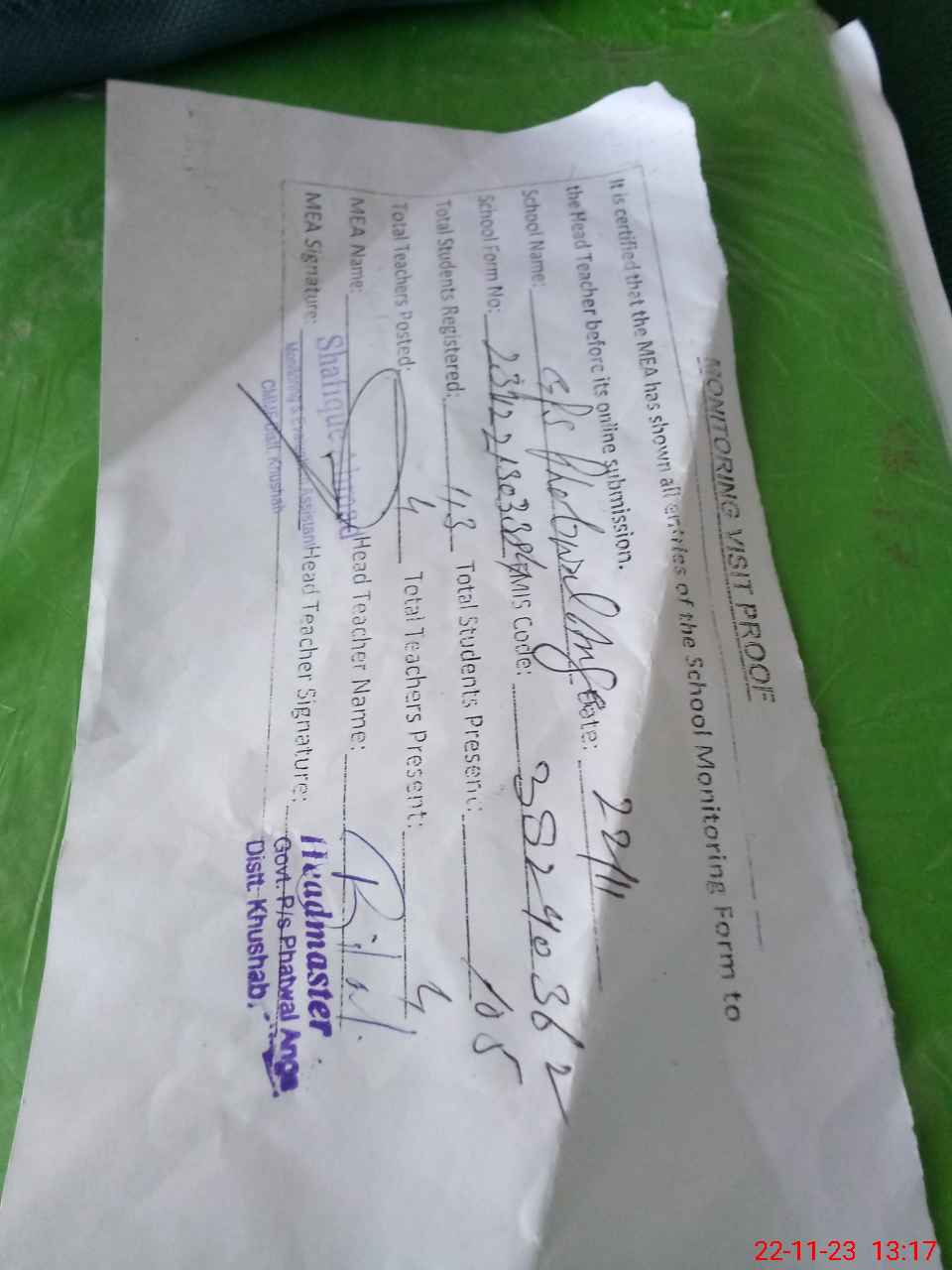 | Attendance Register | Head Teacher | MEA with School | Visit Proof |