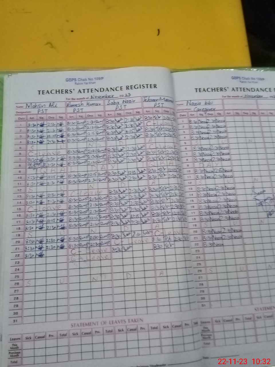 | CNIC | Full Name | Designation | R/C | Absence During Last Calender Month |