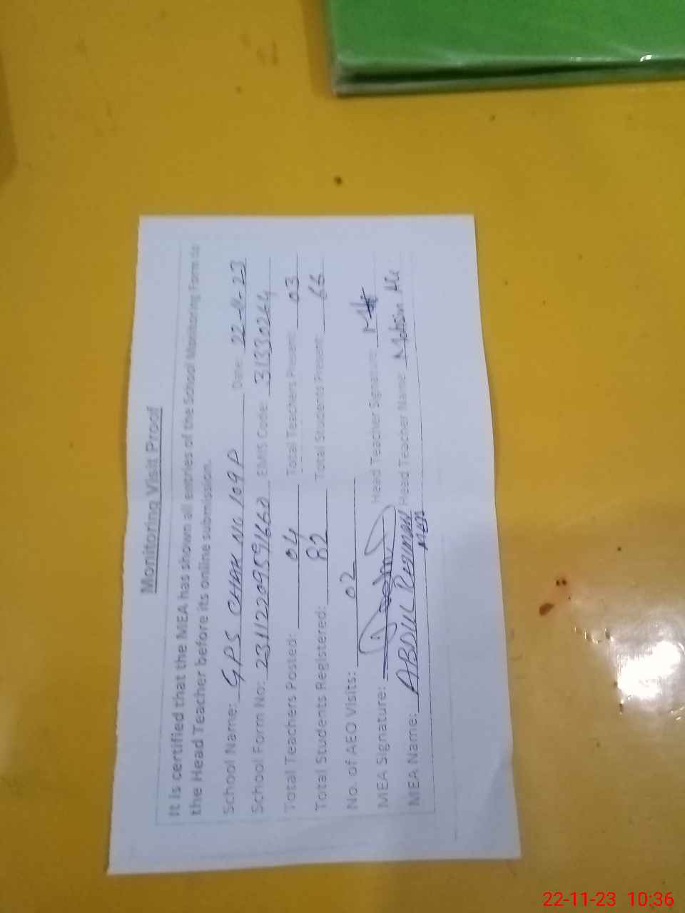 | Attendance Register | Head Teacher | MEA with School | Visit Proof |