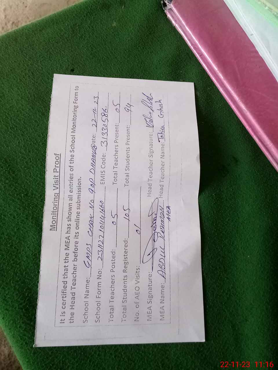 | Attendance Register | Head Teacher | MEA with School | Visit Proof |
