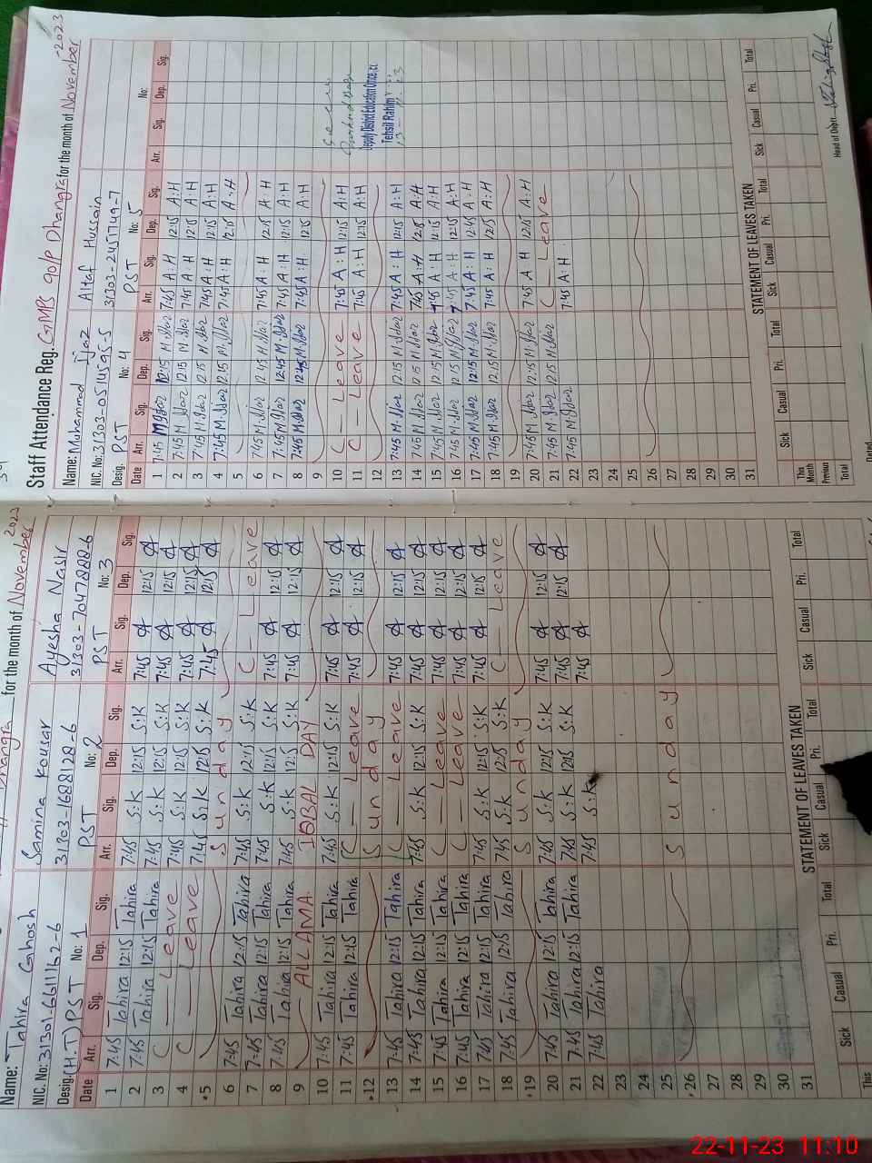 | CNIC | Full Name | Designation | R/C | Absence During Last Calender Month |