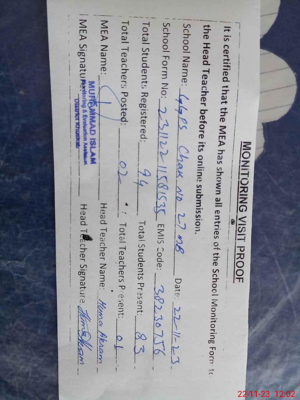 | EMIS Code: 38230756 | Name of School: GGPS CHAK NO 27 MB | |||