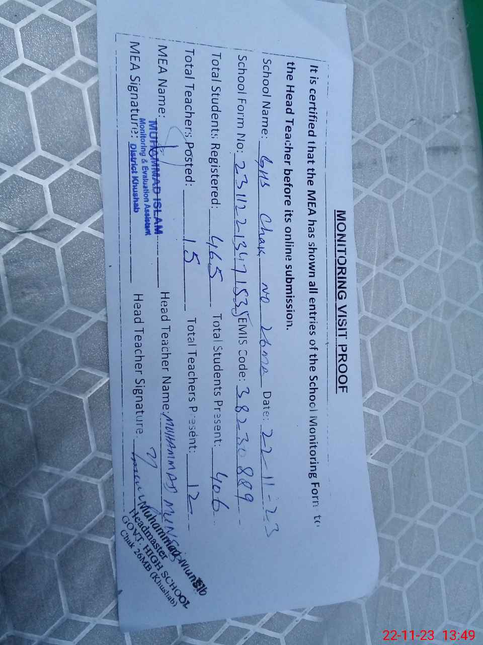 | Attendance Register | Head Teacher | MEA with School | Visit Proof |