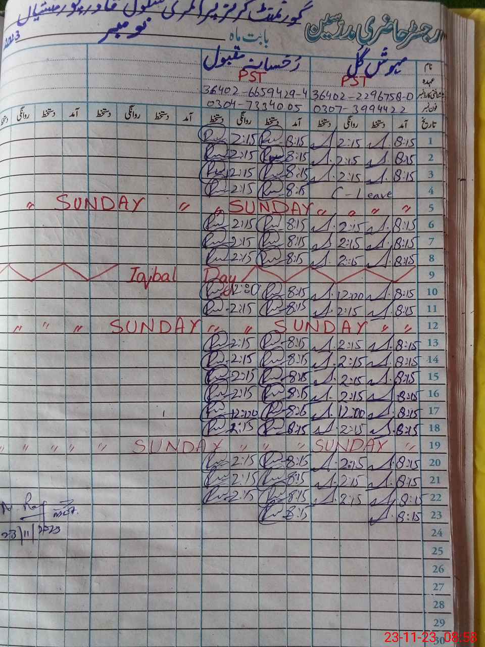 | CNIC | Full Name | Designation | R/C | Absence During Last Calender Month |