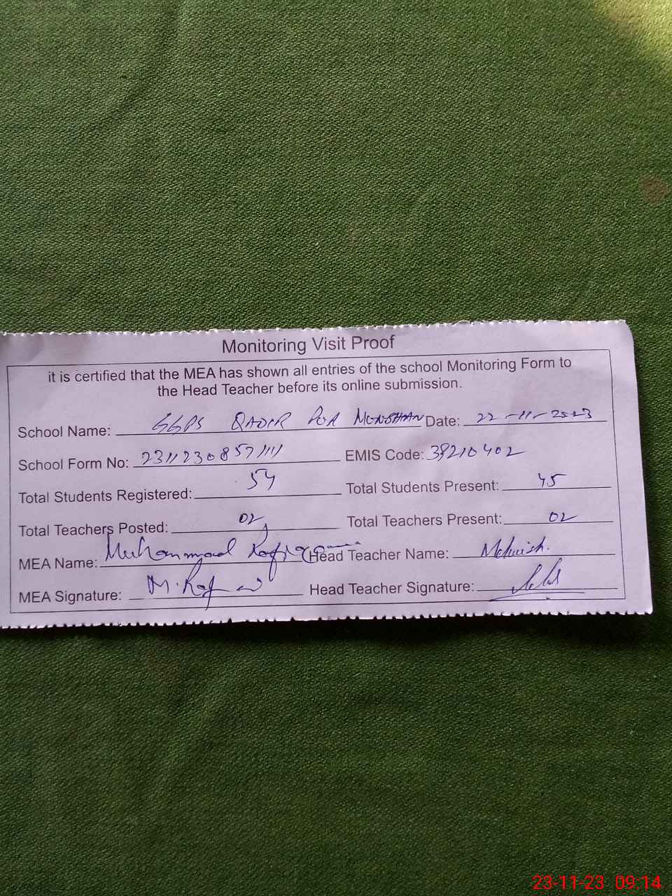 | Attendance Register | Head Teacher | MEA with School | Visit Proof |