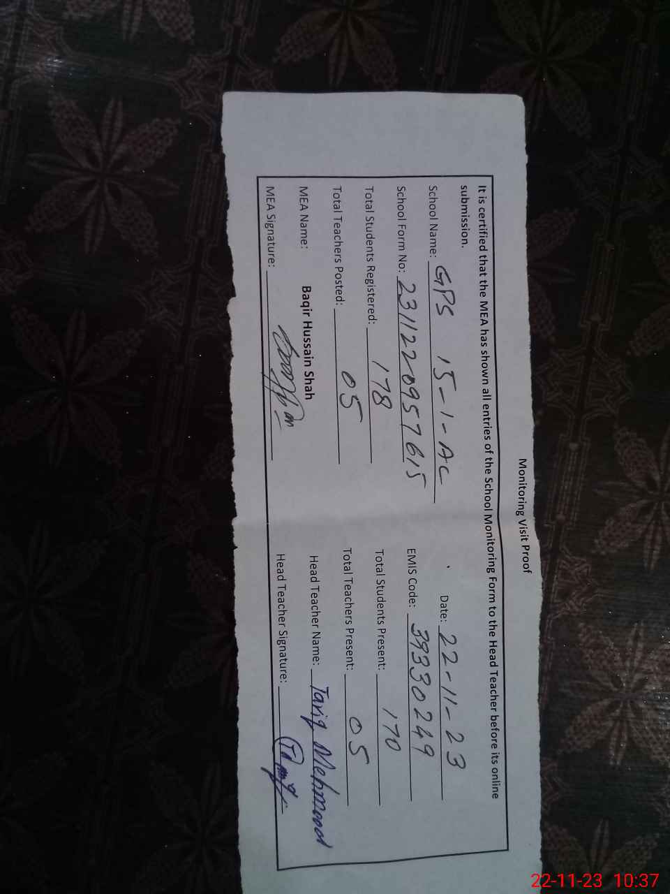 | Name: TA**** ME**** Designation: (School Headmaster's/Headmistress's) HEADMASTER Phone/Cell Number: 03**** |