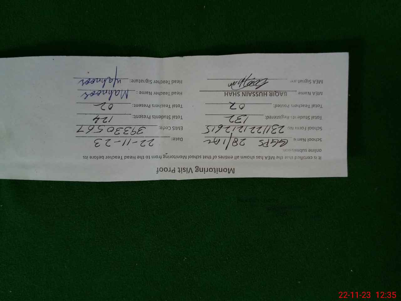 | Attendance Register | Head Teacher | MEA with School | Visit Proof |