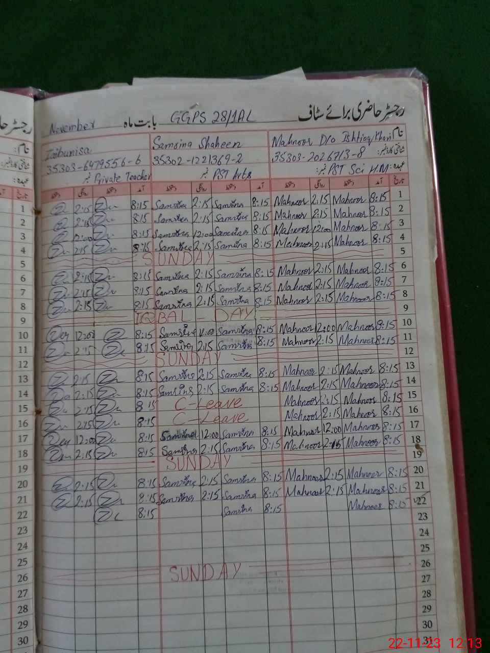 | CNIC | Full Name | Designation | R/C | Absence During Last Calender Month |
