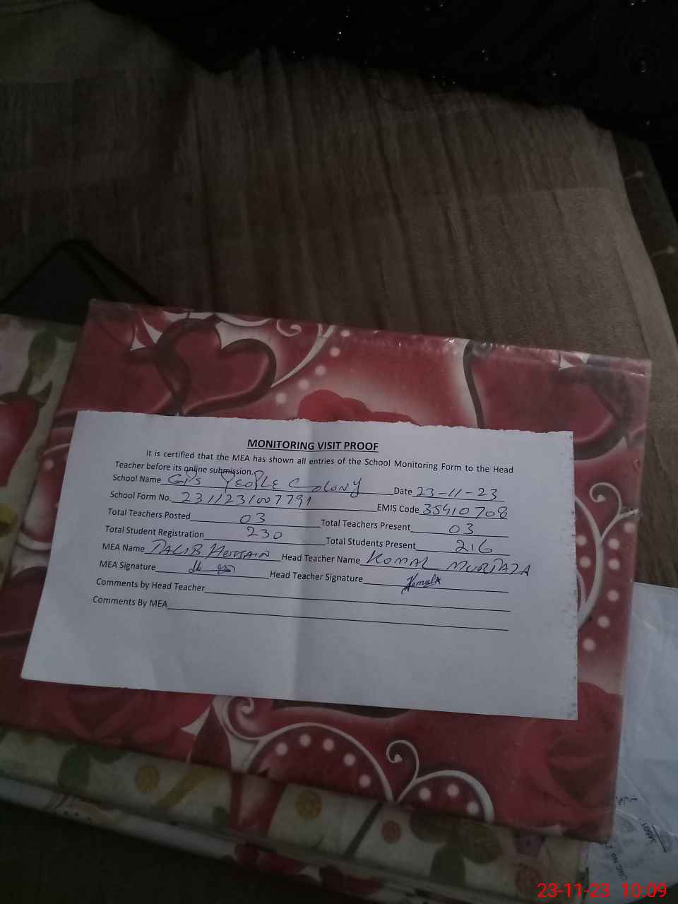 | Attendance Register | Head Teacher | MEA with School | Visit Proof |