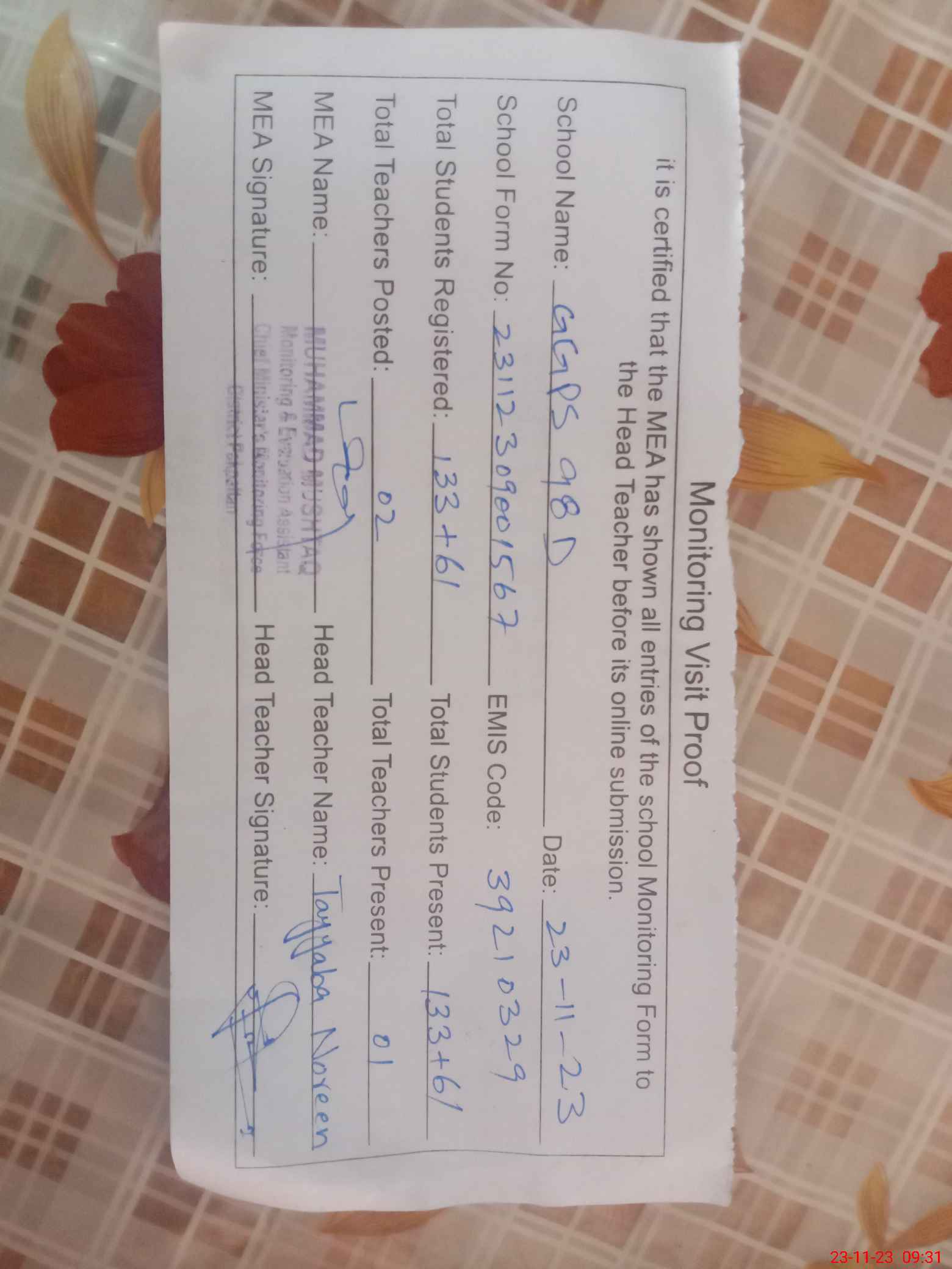 | Attendance Register | Head Teacher | MEA with School | Visit Proof |