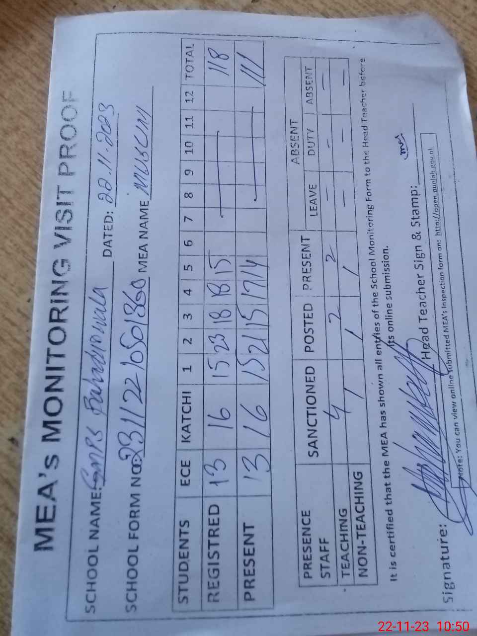| Attendance Register | Head Teacher | MEA with School | Visit Proof |