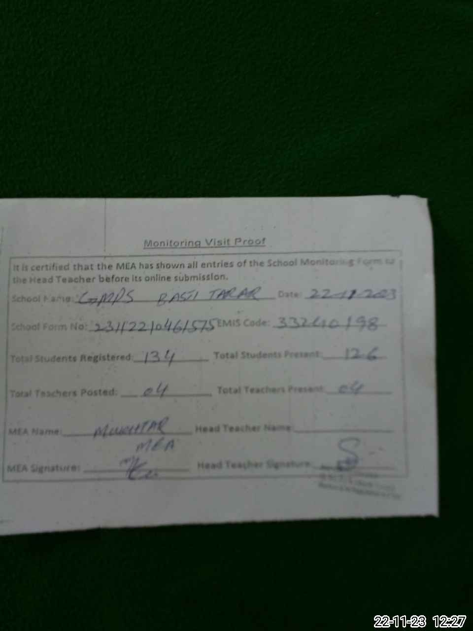 | EMIS Code: 33240198 | Name of School: GMPS BASTI TARAR | |||