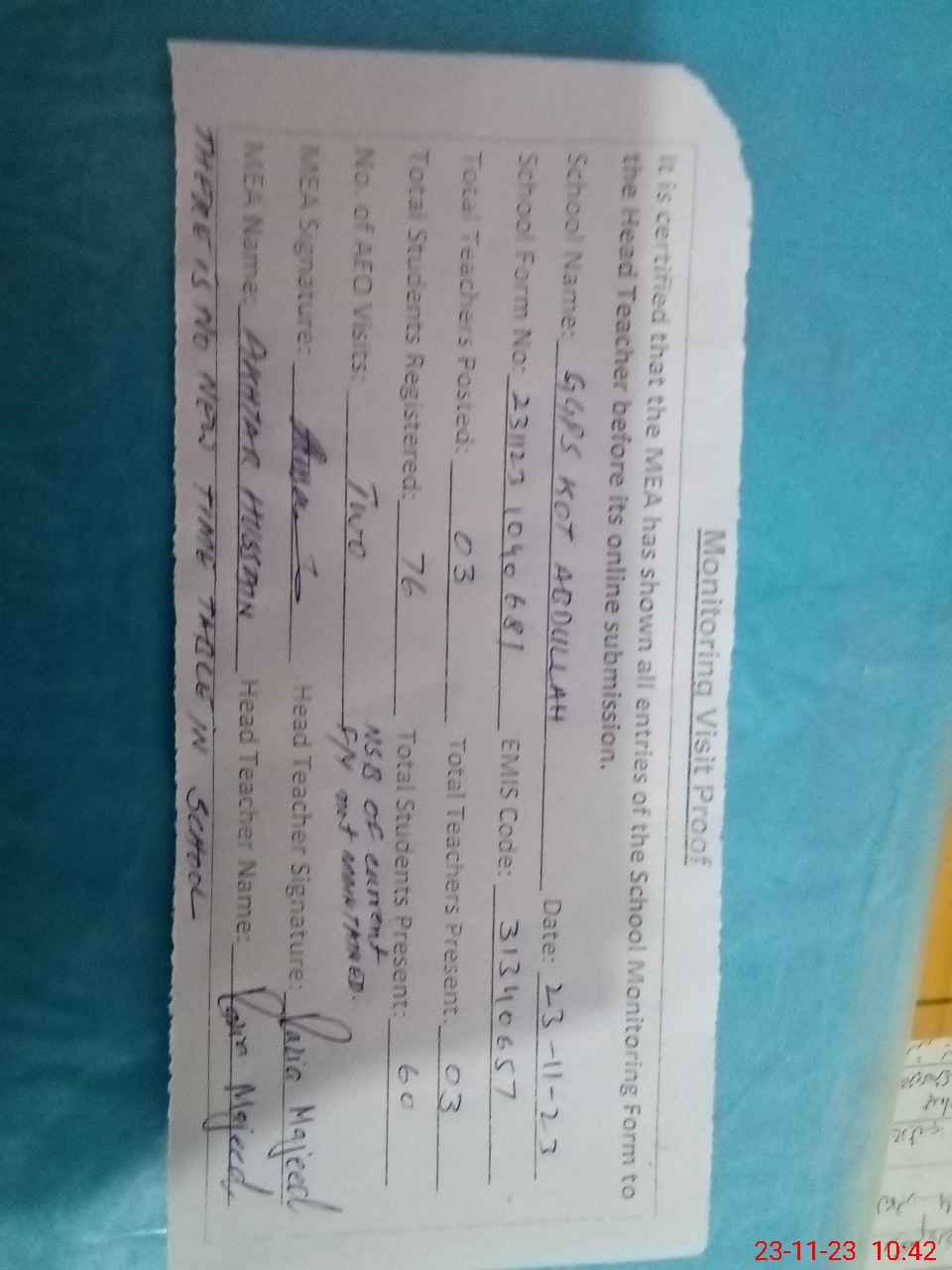 | Attendance Register | Head Teacher | MEA with School | Visit Proof |