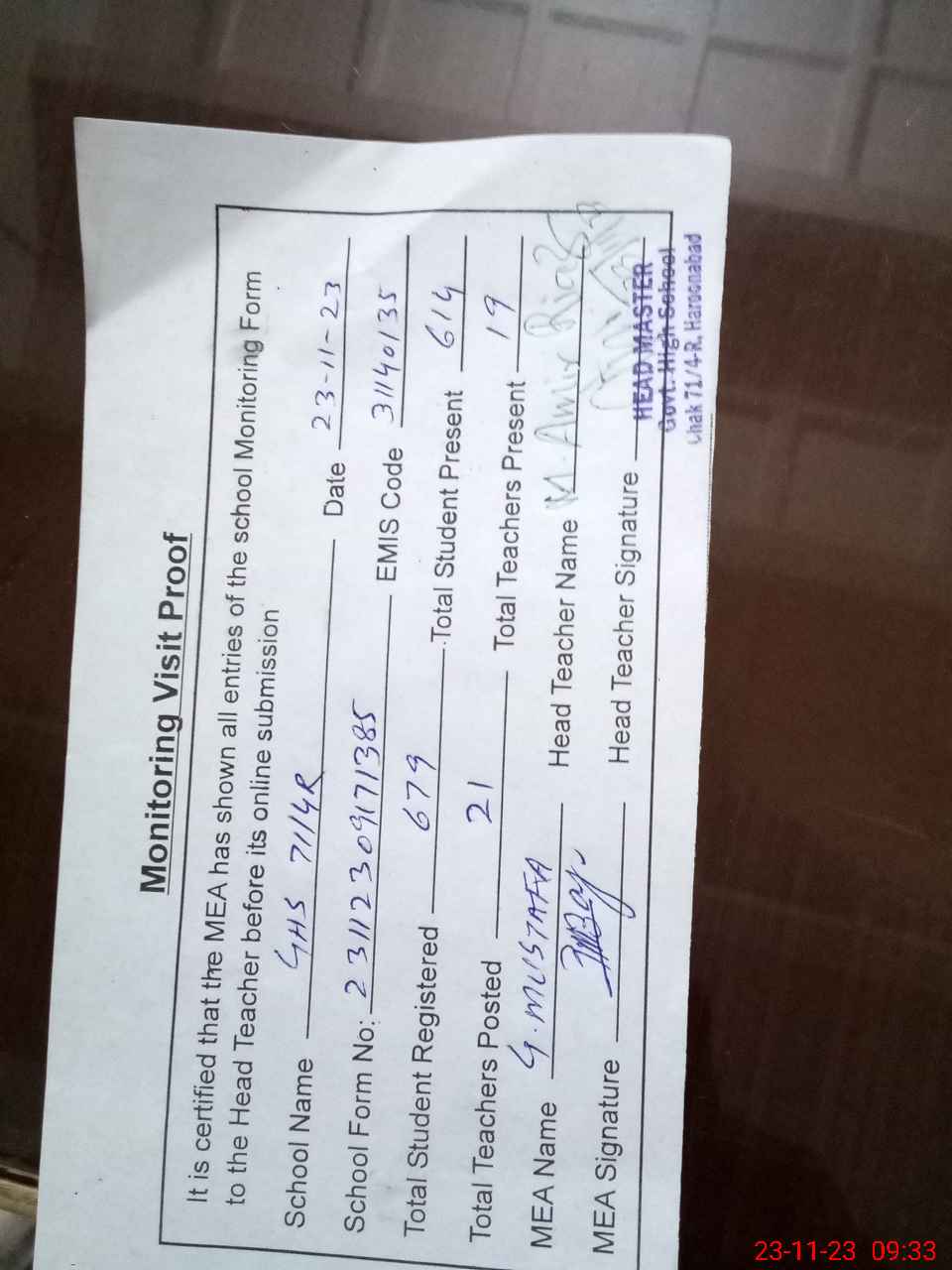 | EMIS Code: 31140135 | Name of School: GHS CHAK NO 71/4-R | |||