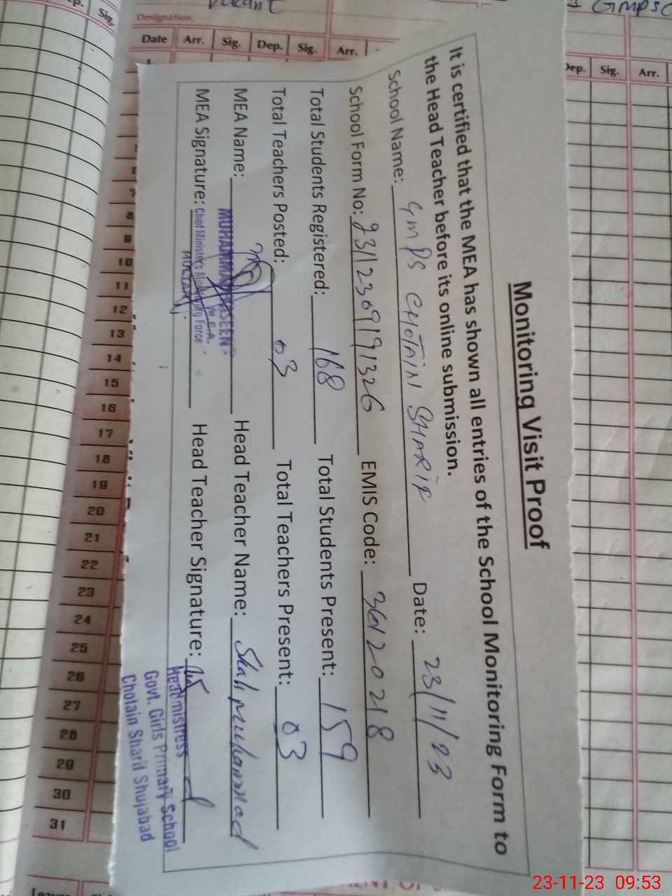 | Attendance Register | Head Teacher | MEA with School | Visit Proof |