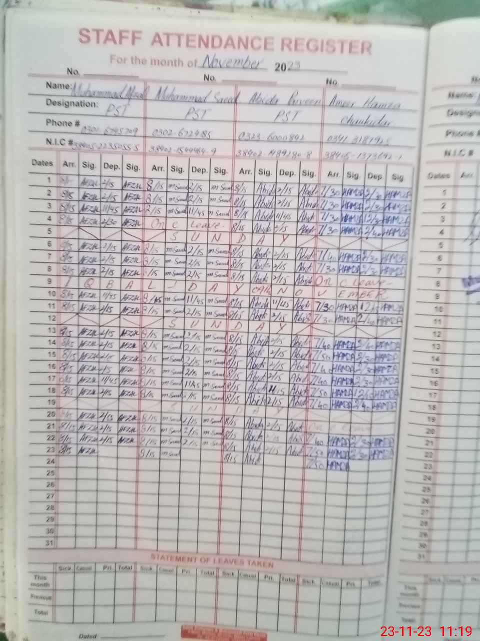 | CNIC | Full Name | Designation | R/C | Absence During Last Calender Month |