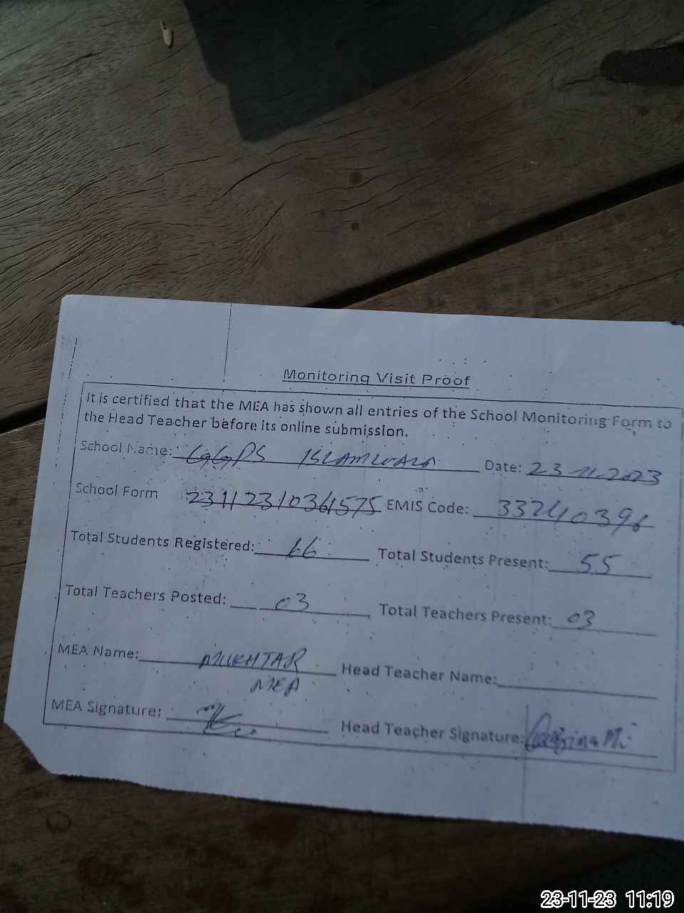 | Attendance Register | Head Teacher | MEA with School | Visit Proof |