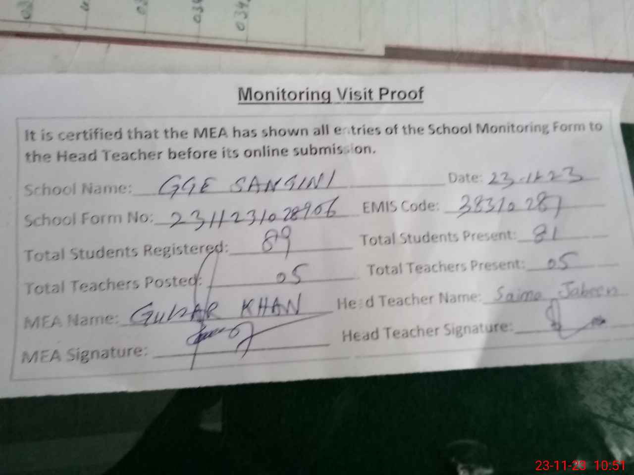 | Attendance Register | Head Teacher | MEA with School | Visit Proof |