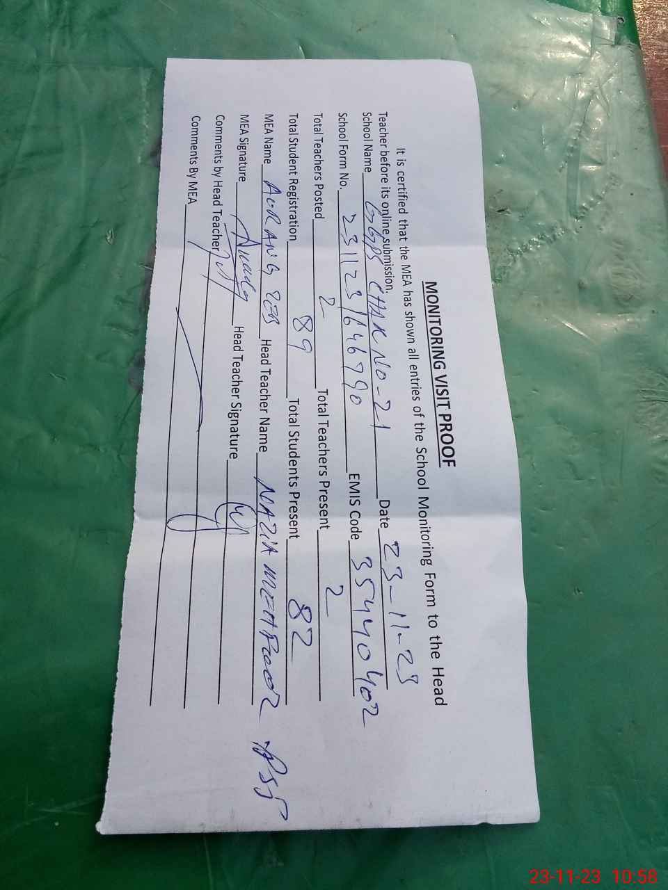 | Attendance Register | Head Teacher | MEA with School | Visit Proof |