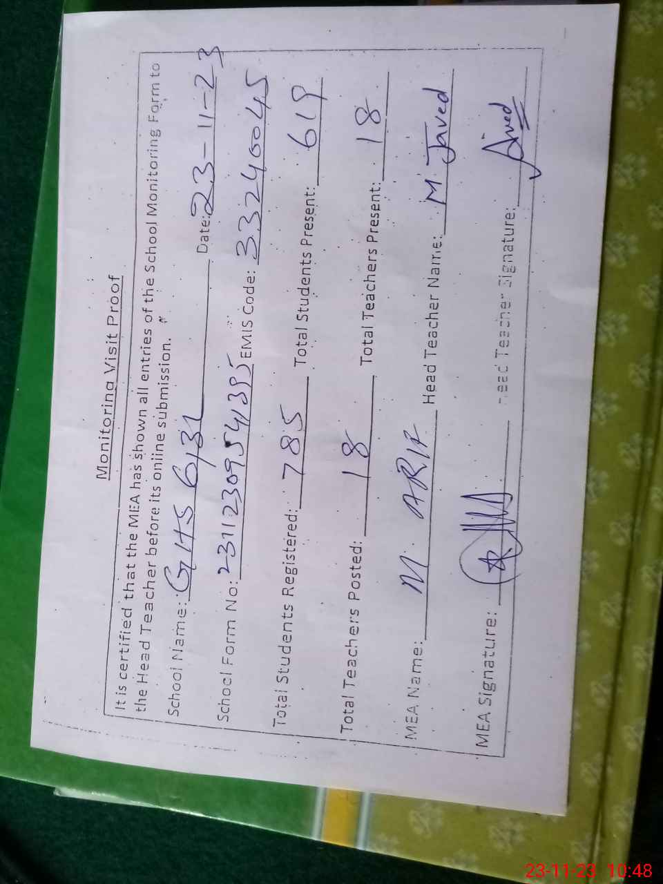 | EMIS Code: 33240045 | Name of School: GHS CHAK NO 6/3-L | |||