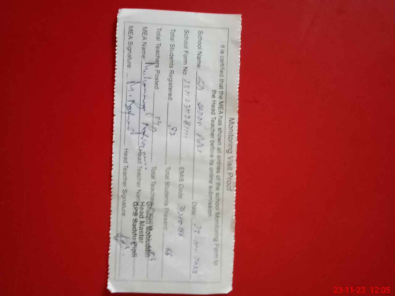 | Attendance Register | Head Teacher | MEA with School | Visit Proof |