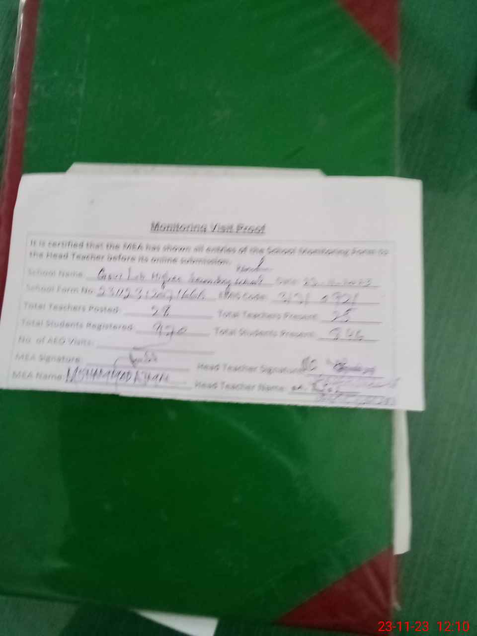 | Attendance Register | Head Teacher | MEA with School | Visit Proof |