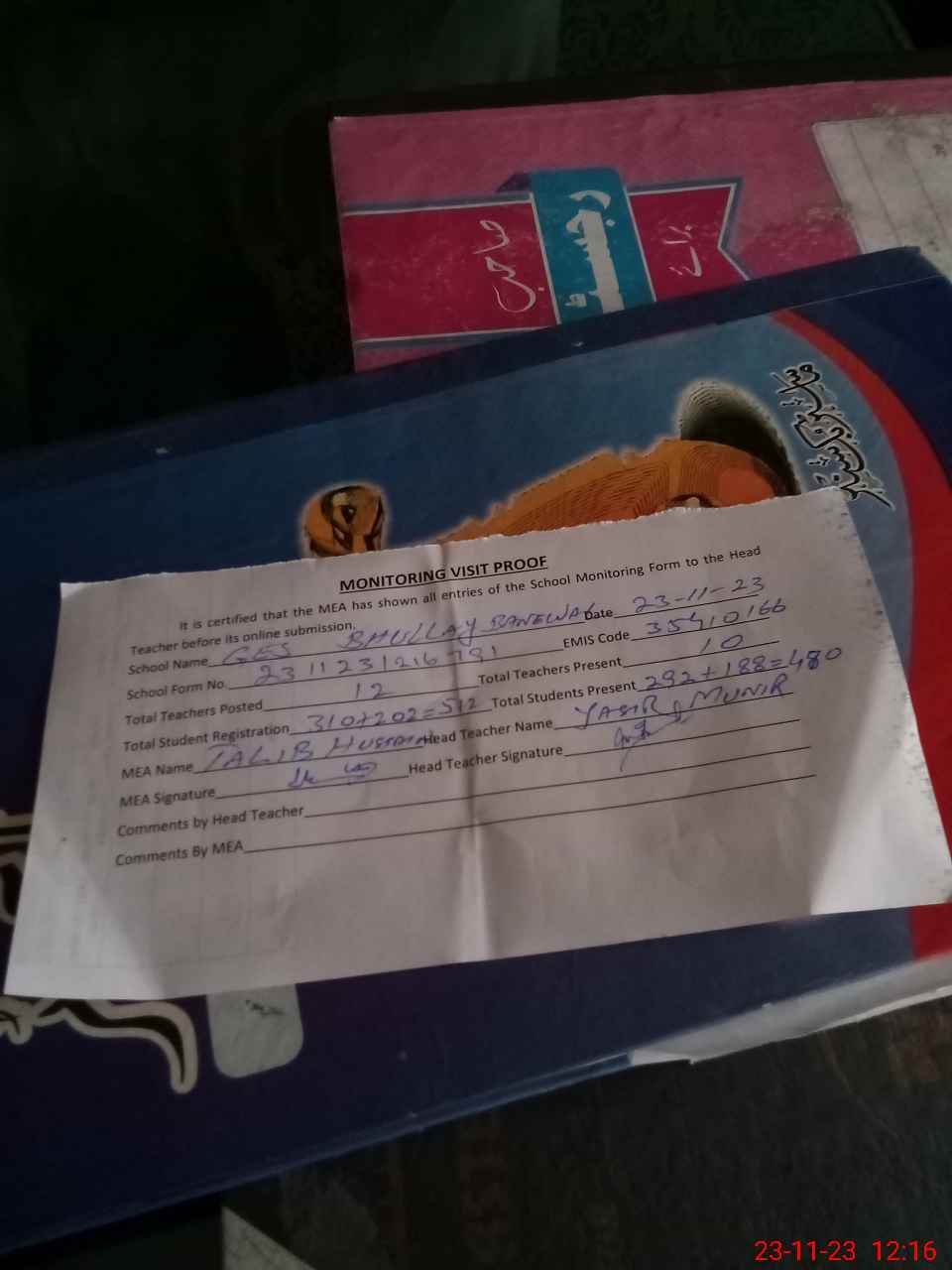 | Attendance Register | Head Teacher | MEA with School | Visit Proof |