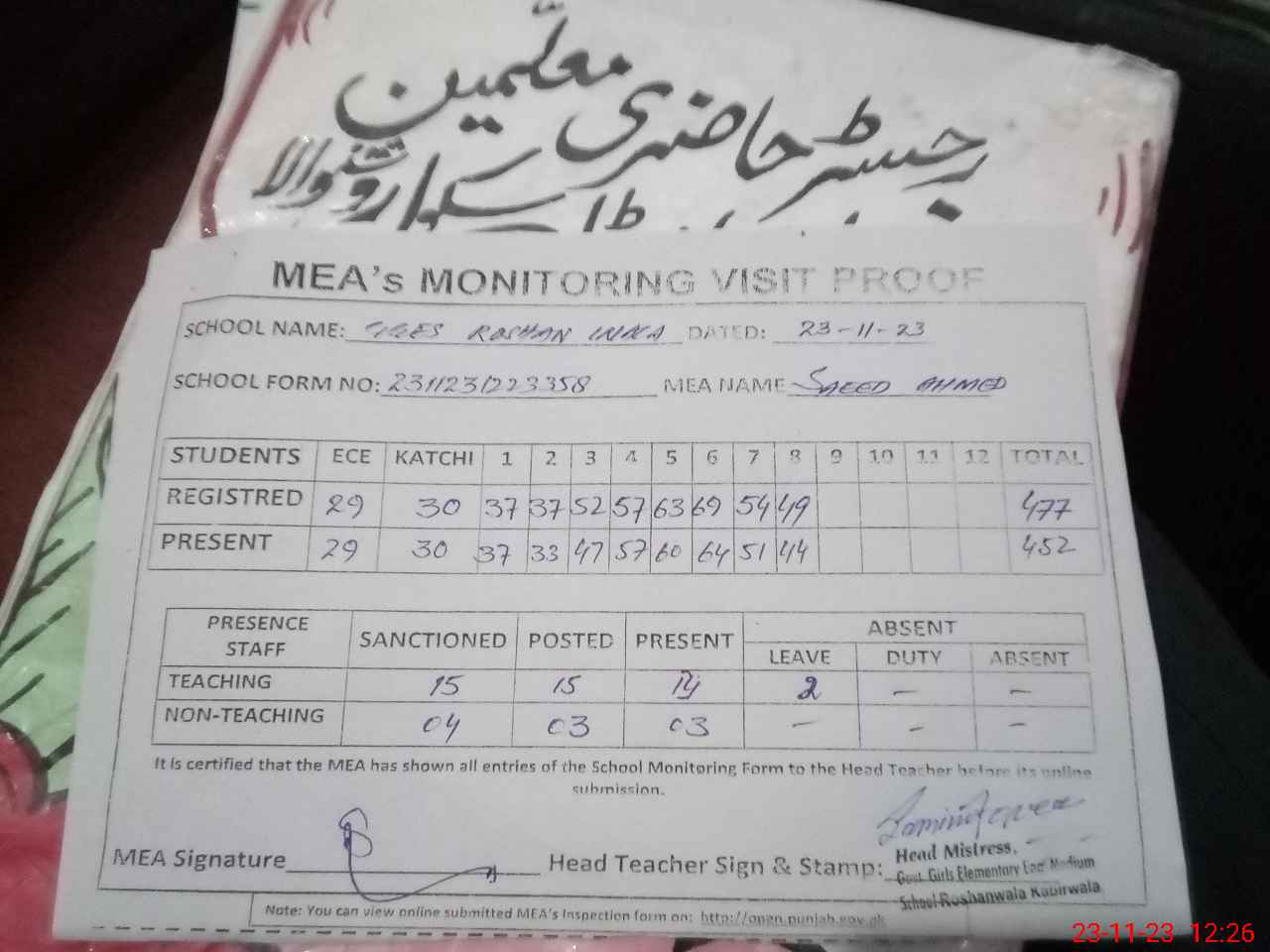 | Attendance Register | Head Teacher | MEA with School | Visit Proof |