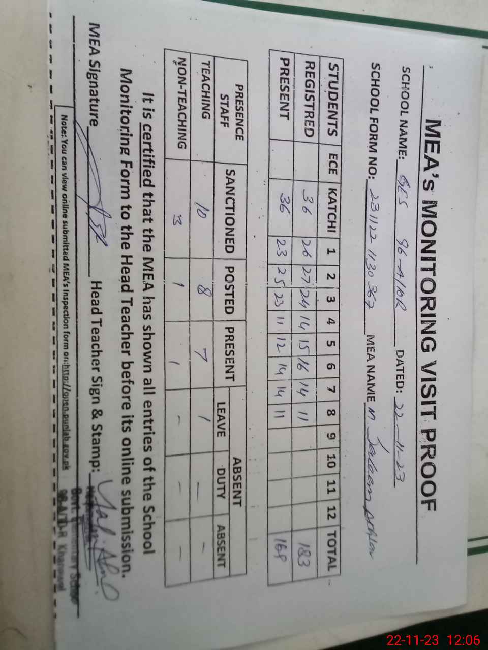 | Attendance Register | Head Teacher | MEA with School | Visit Proof |