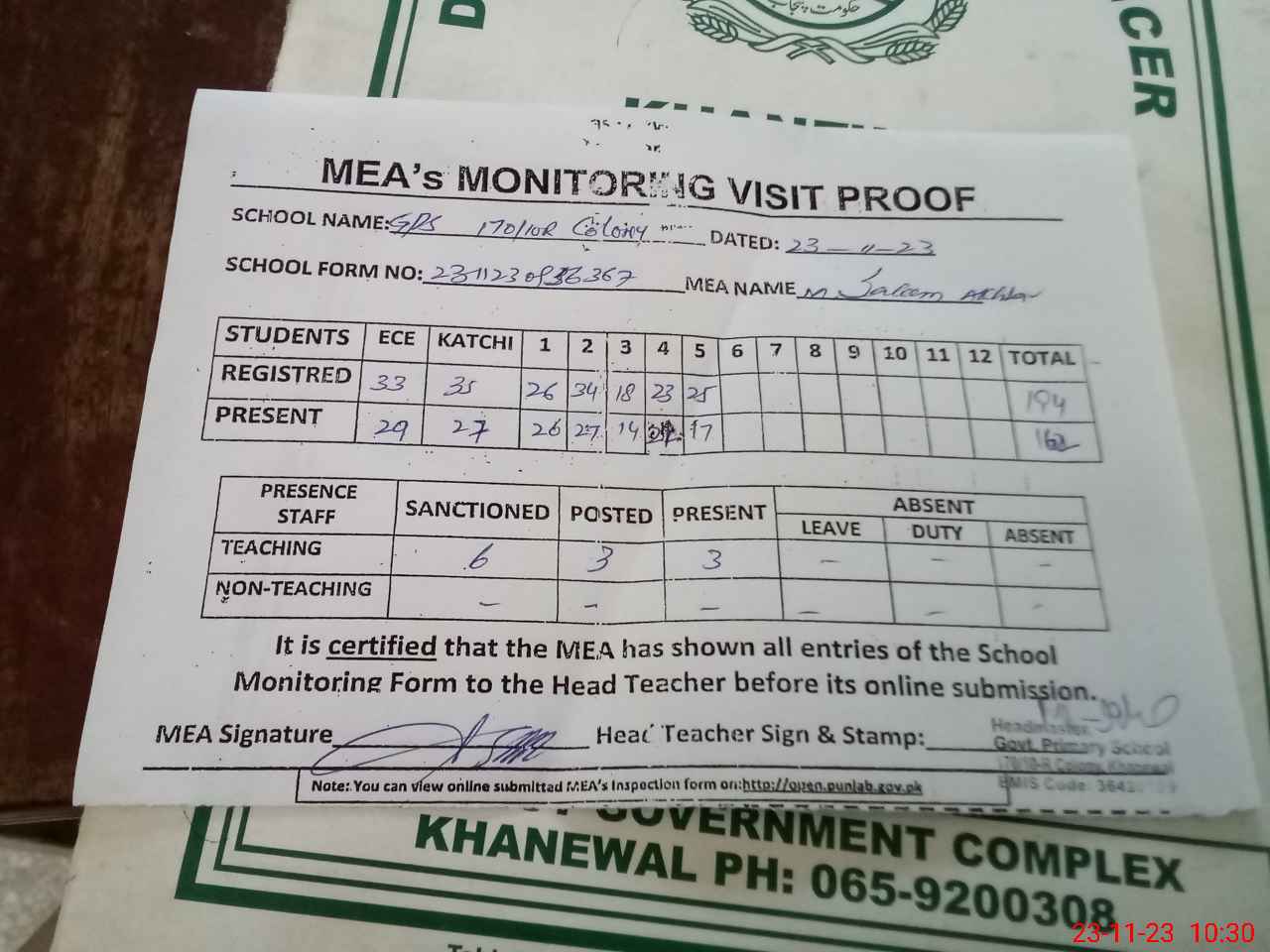 | Attendance Register | Head Teacher | MEA with School | Visit Proof |