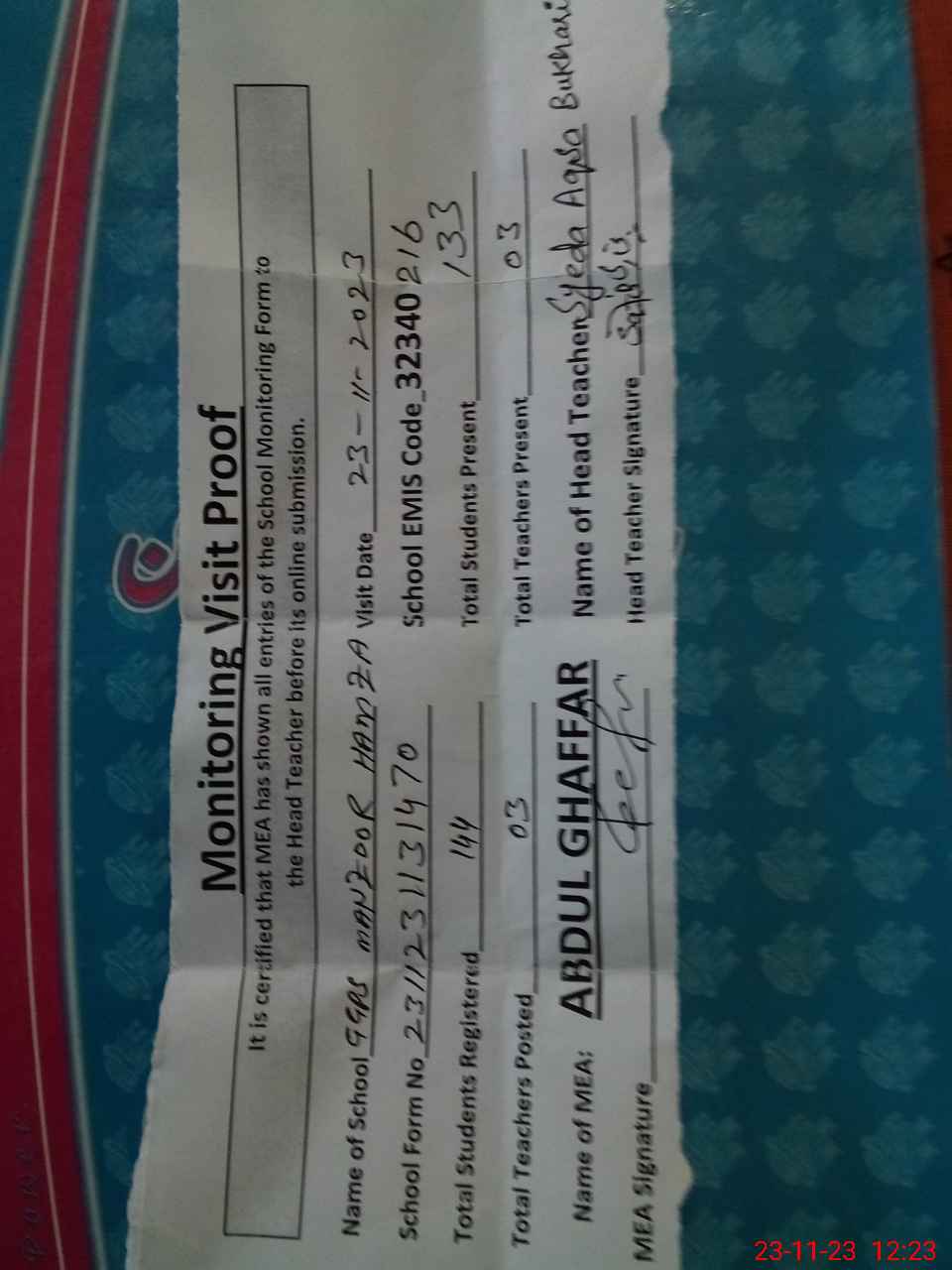 | Attendance Register | Head Teacher | MEA with School | Visit Proof |