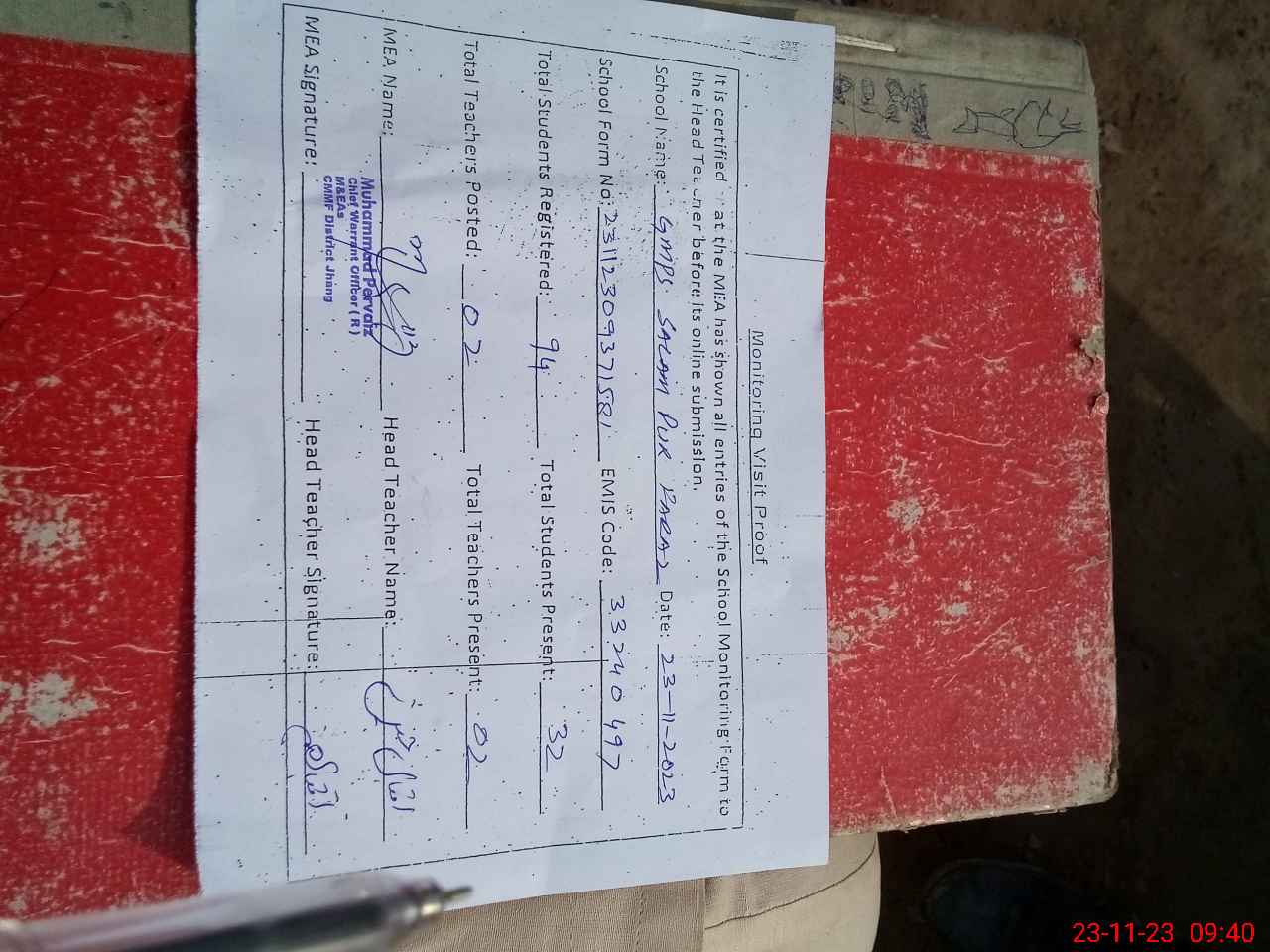 | Attendance Register | Head Teacher | MEA with School | Visit Proof |