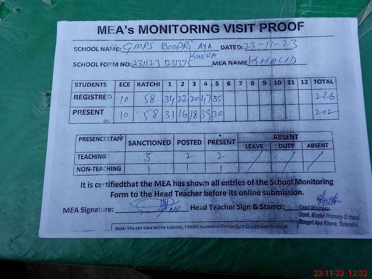 | Attendance Register | Head Teacher | MEA with School | Visit Proof |