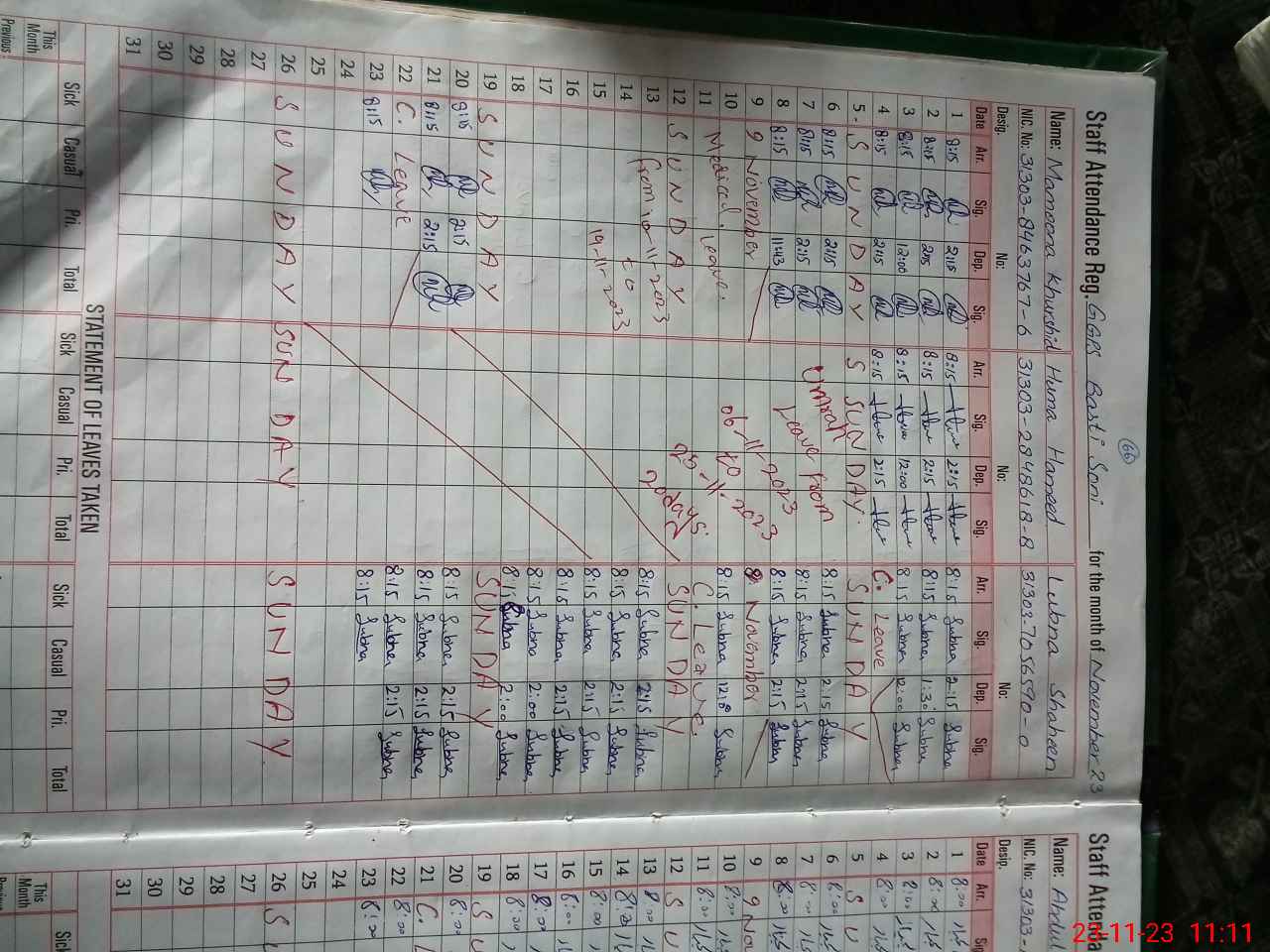 | CNIC | Full Name | Designation | R/C | Absence During Last Calender Month |