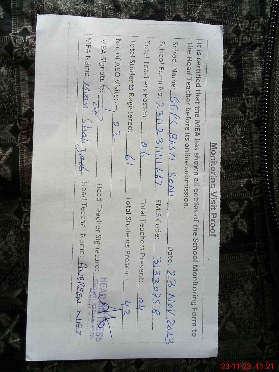 | Attendance Register | Head Teacher | MEA with School | Visit Proof |