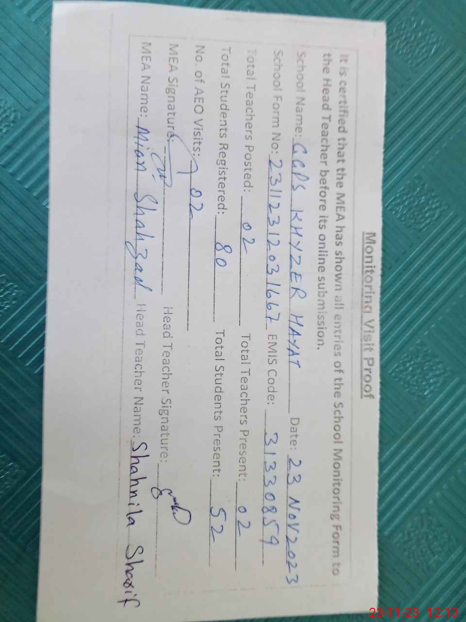 | EMIS Code: 31330859 | Name of School: GGPS KHYZER HAYAT | |||