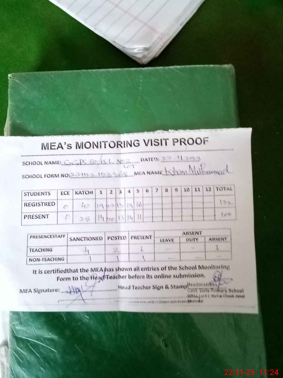 | Attendance Register | Head Teacher | MEA with School | Visit Proof |