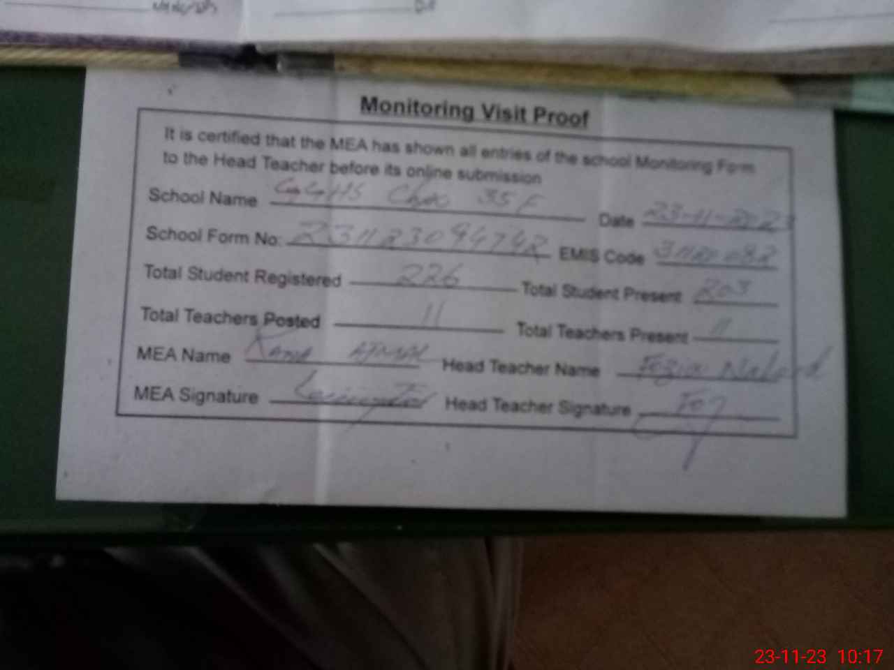 | Attendance Register | Head Teacher | MEA with School | Visit Proof |
