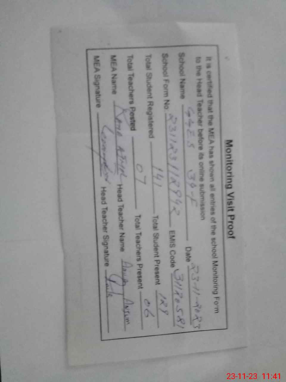 | Attendance Register | Head Teacher | MEA with School | Visit Proof |