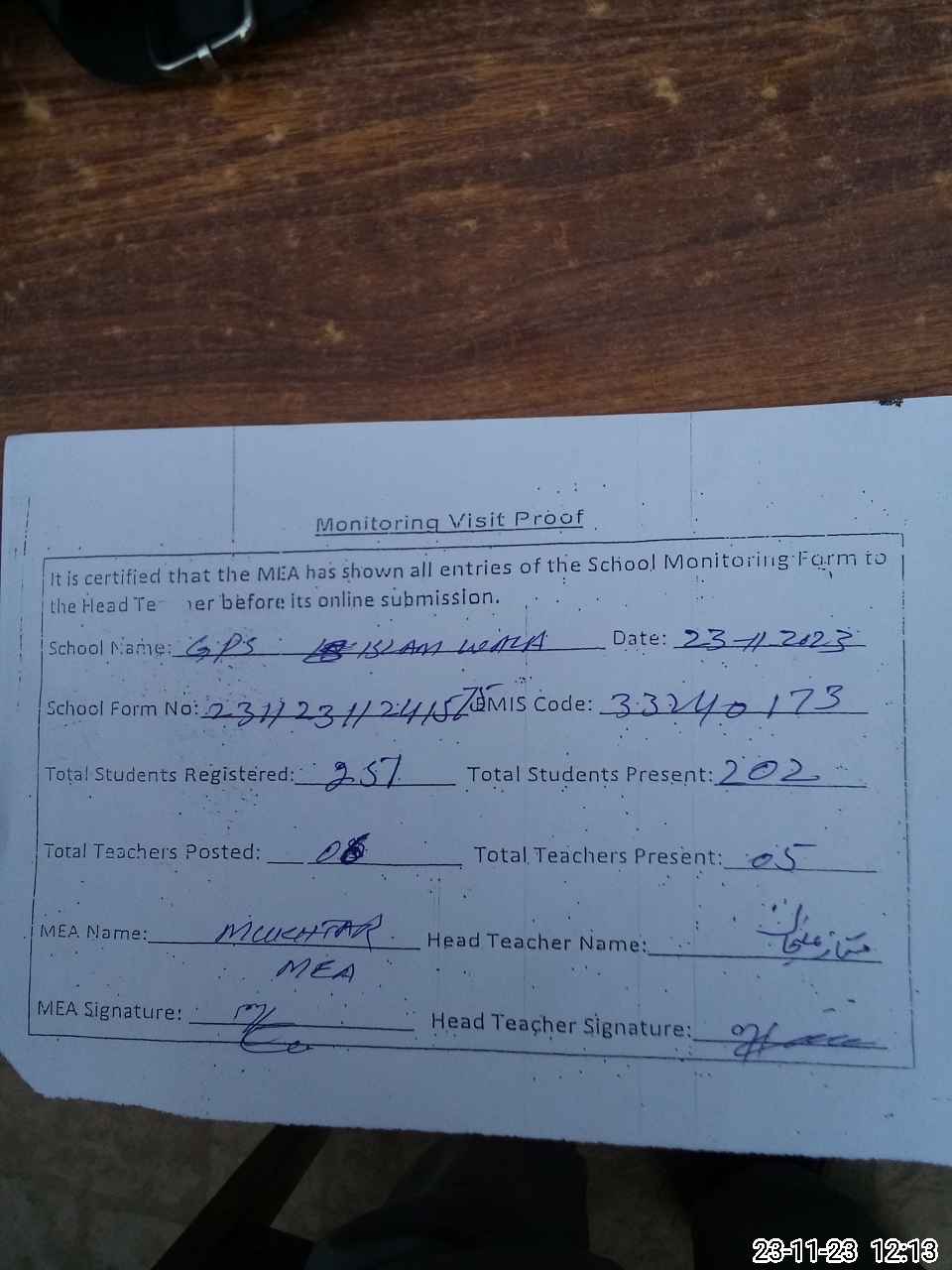| EMIS Code: 33240173 | Name of School: GPS ISLAM WALA | |||