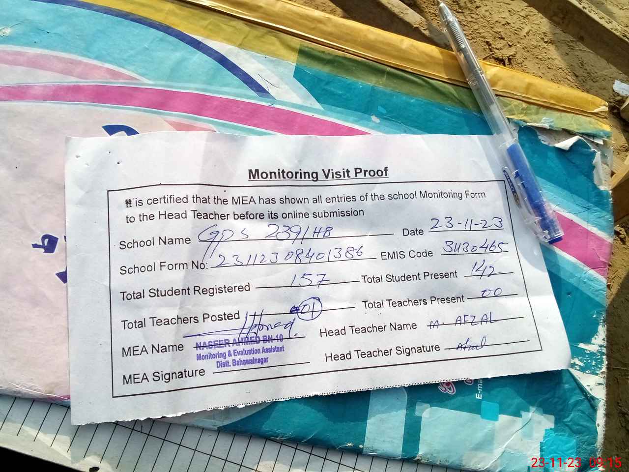 | Attendance Register | Head Teacher | MEA with School | Visit Proof |