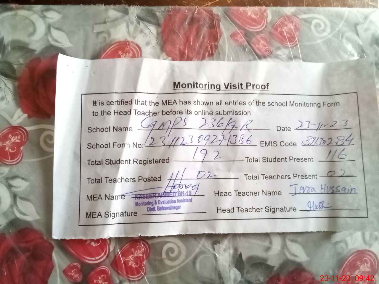 | Attendance Register | Head Teacher | MEA with School | Visit Proof |