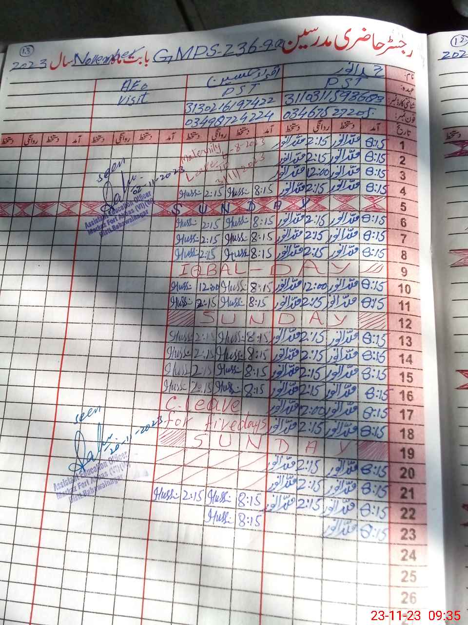 | Name: Iq**** Hu**** Designation: (School Headmaster's/Headmistress's) PST Phone/Cell Number: 03**** |