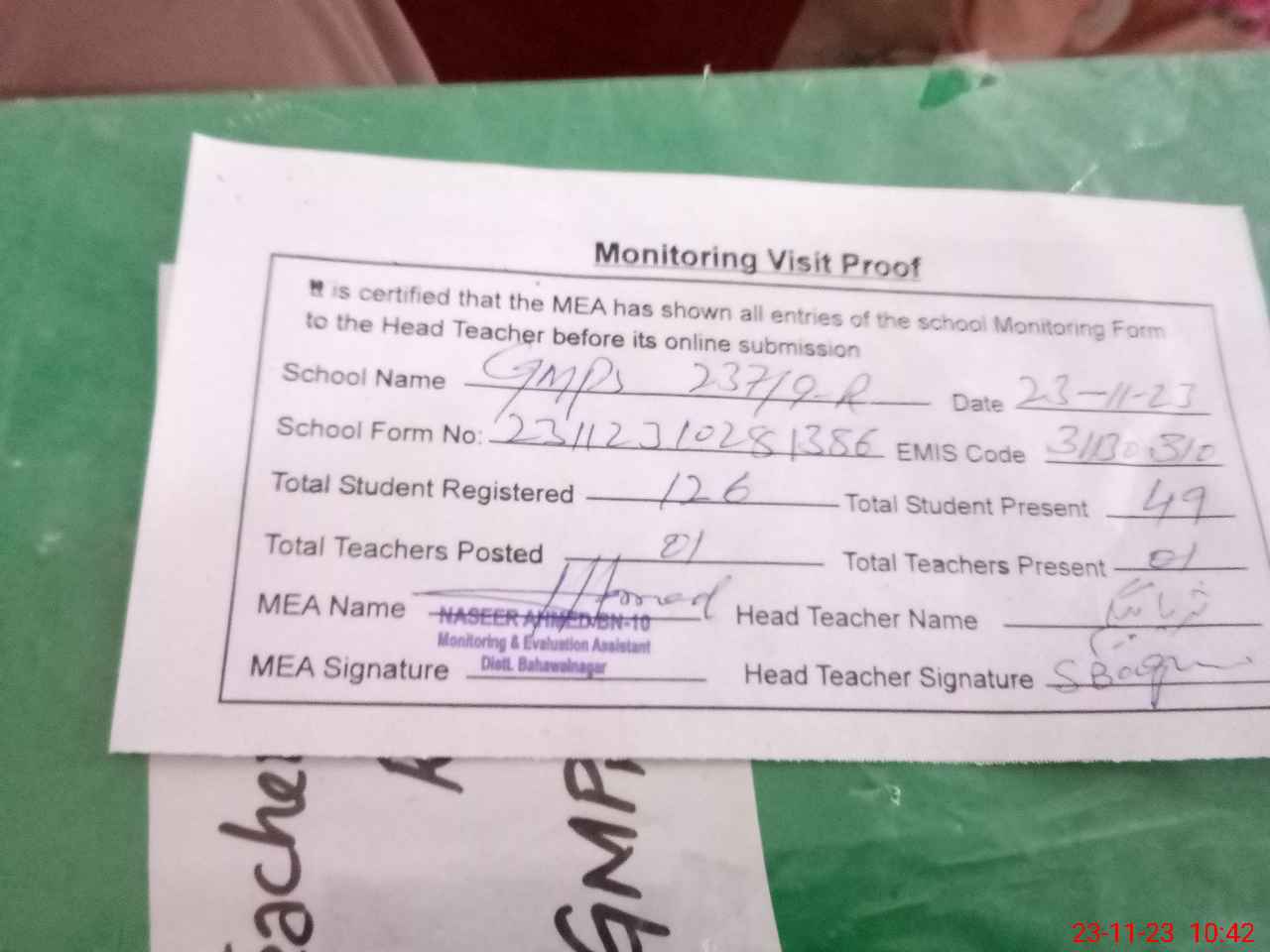 | EMIS Code: 31130310 | Name of School: GMPS CHAK NO. 237/9-R | |||