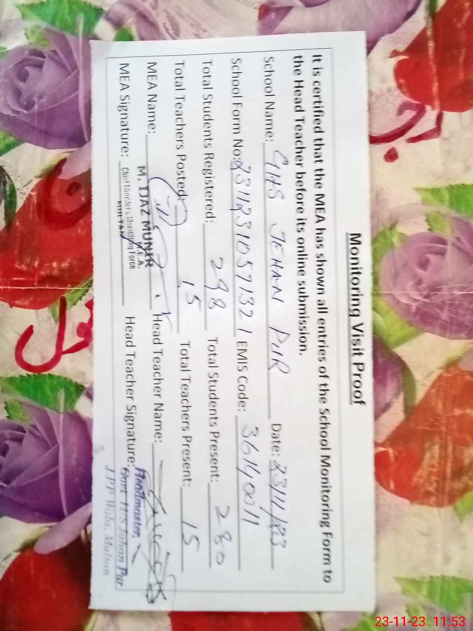 | Attendance Register | Head Teacher | MEA with School | Visit Proof |