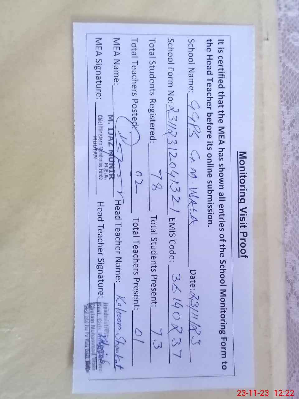 | EMIS Code: 36140237 | Name of School: GGPS GHULAM MOHAMMAD WALA | |||