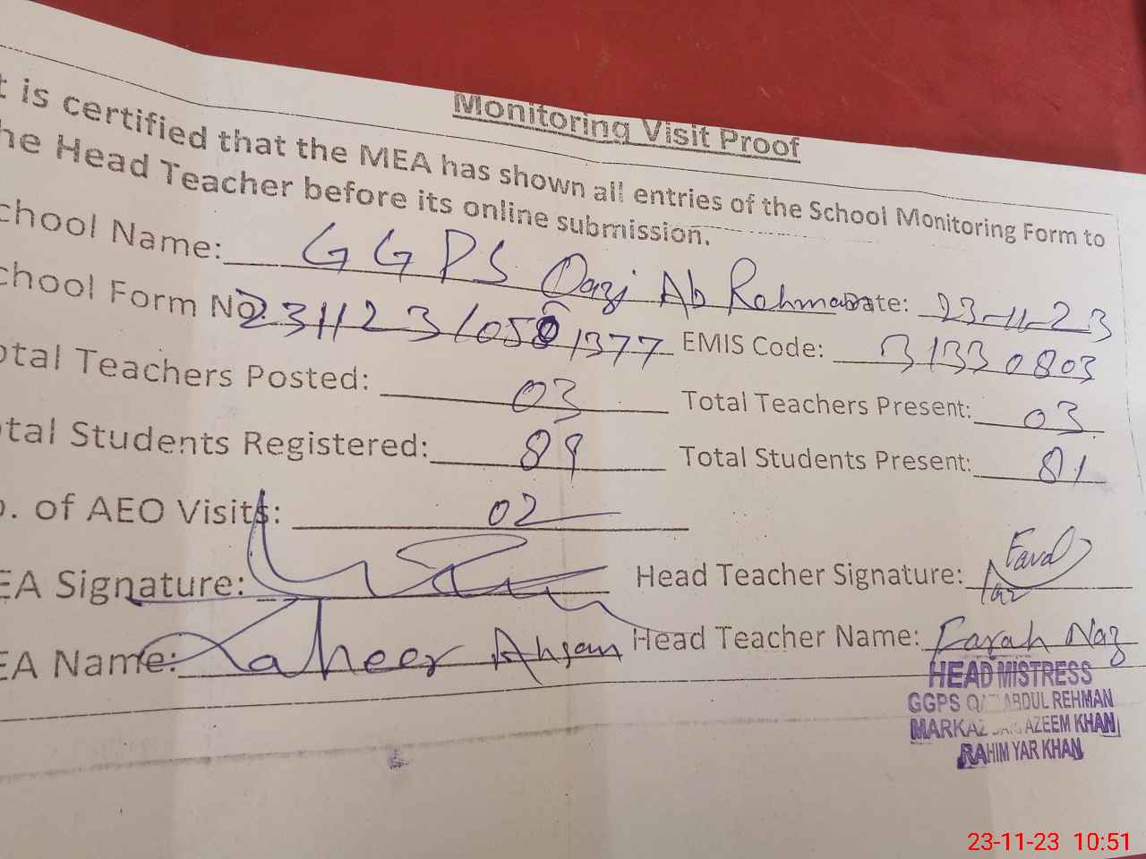 | Attendance Register | Head Teacher | MEA with School | Visit Proof |