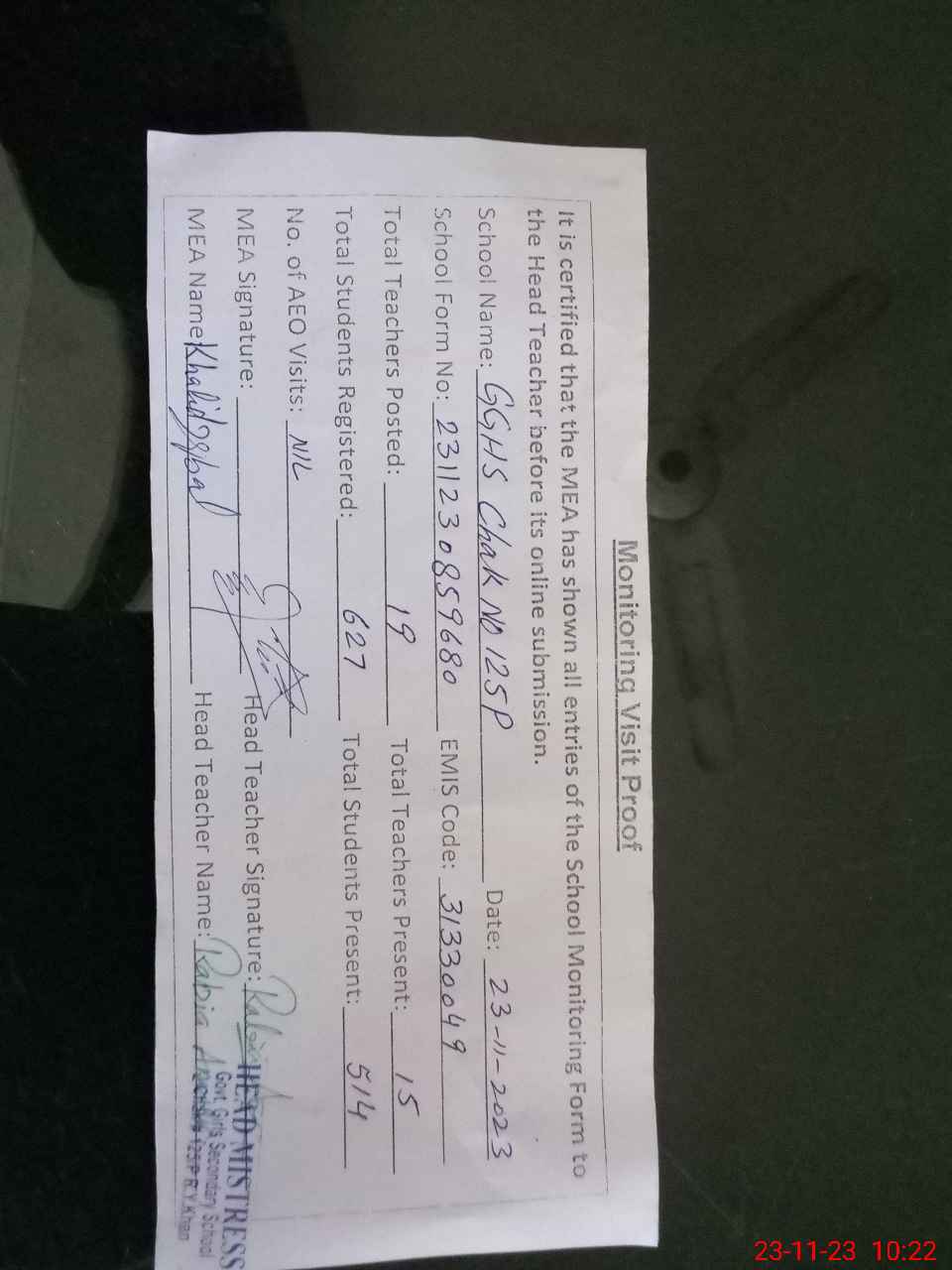 | EMIS Code: 31330049 | Name of School: GGHS CHAK NO. 125/P | |||