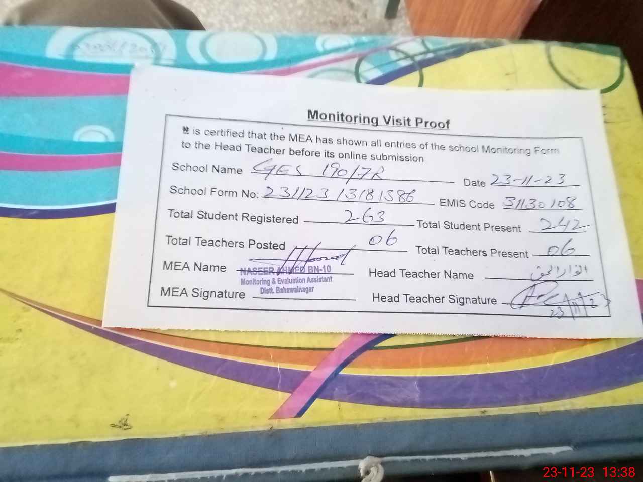 | EMIS Code: 31130108 | Name of School: GHS CHAK NO.190/7-R | |||